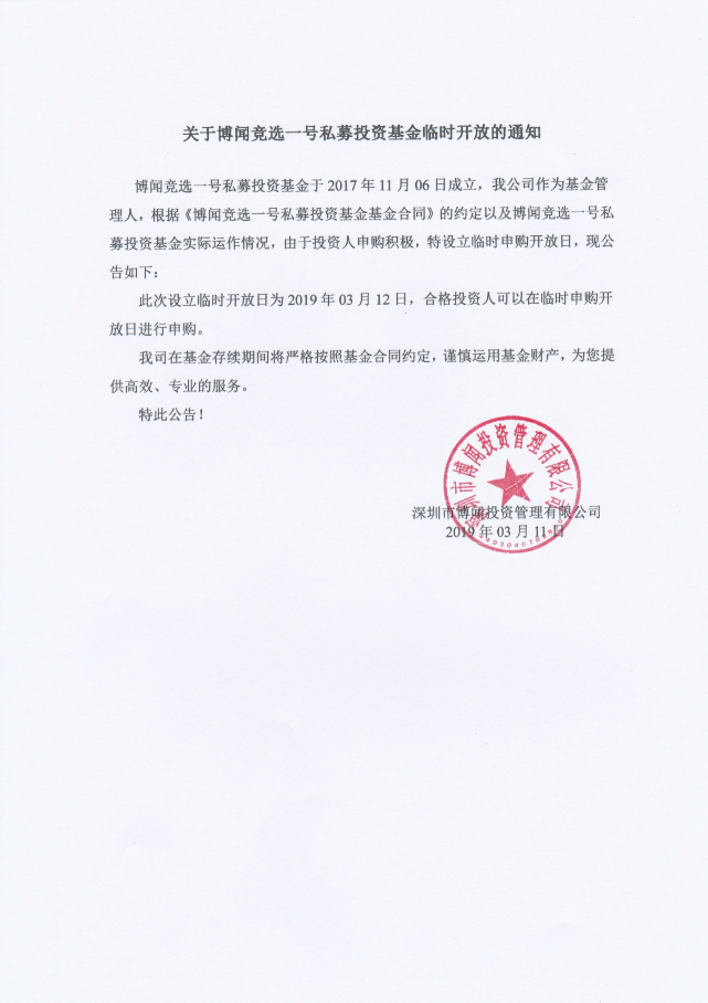 关于博闻竞选一号私募投资基金临时开放申购的通知