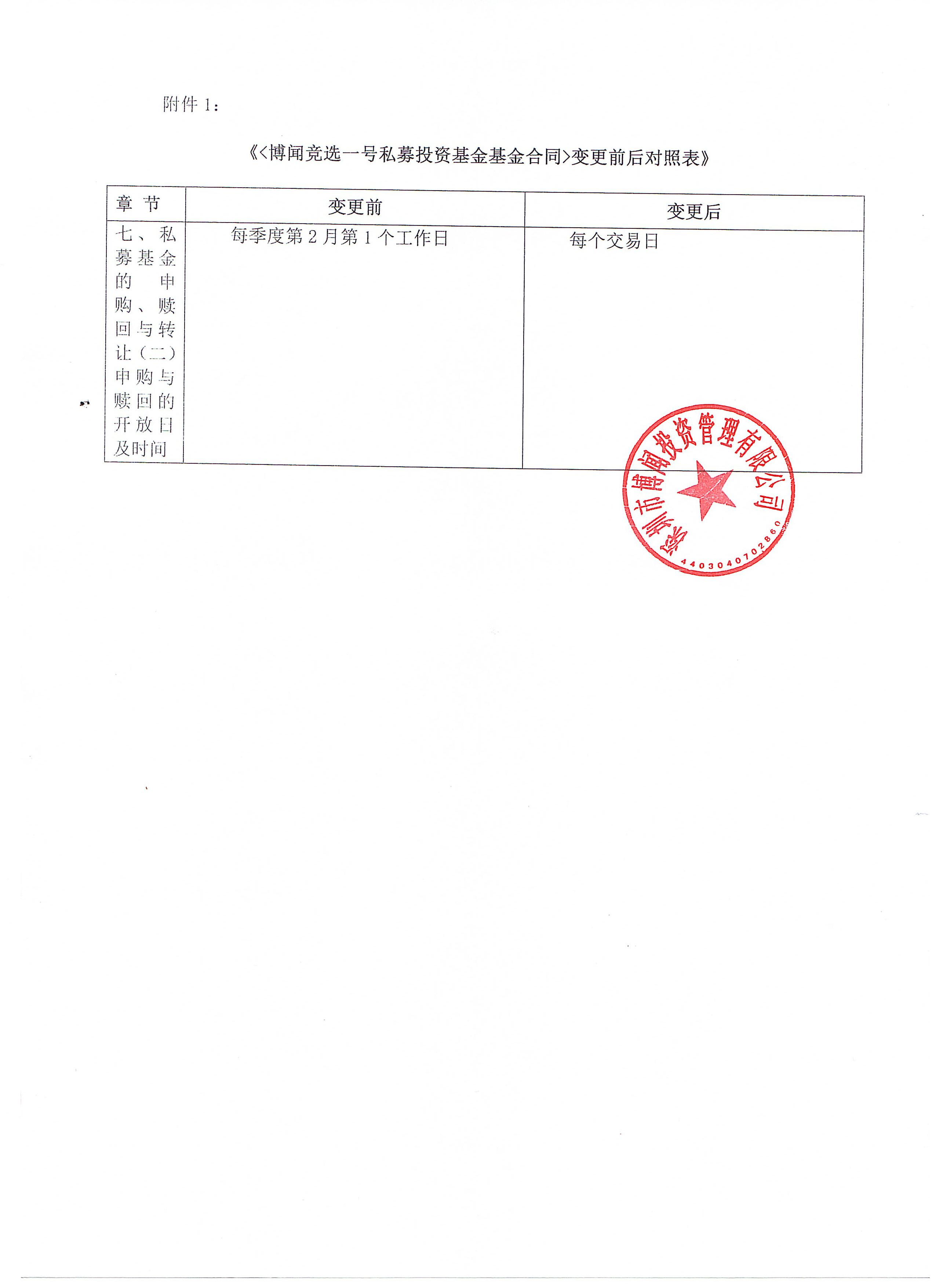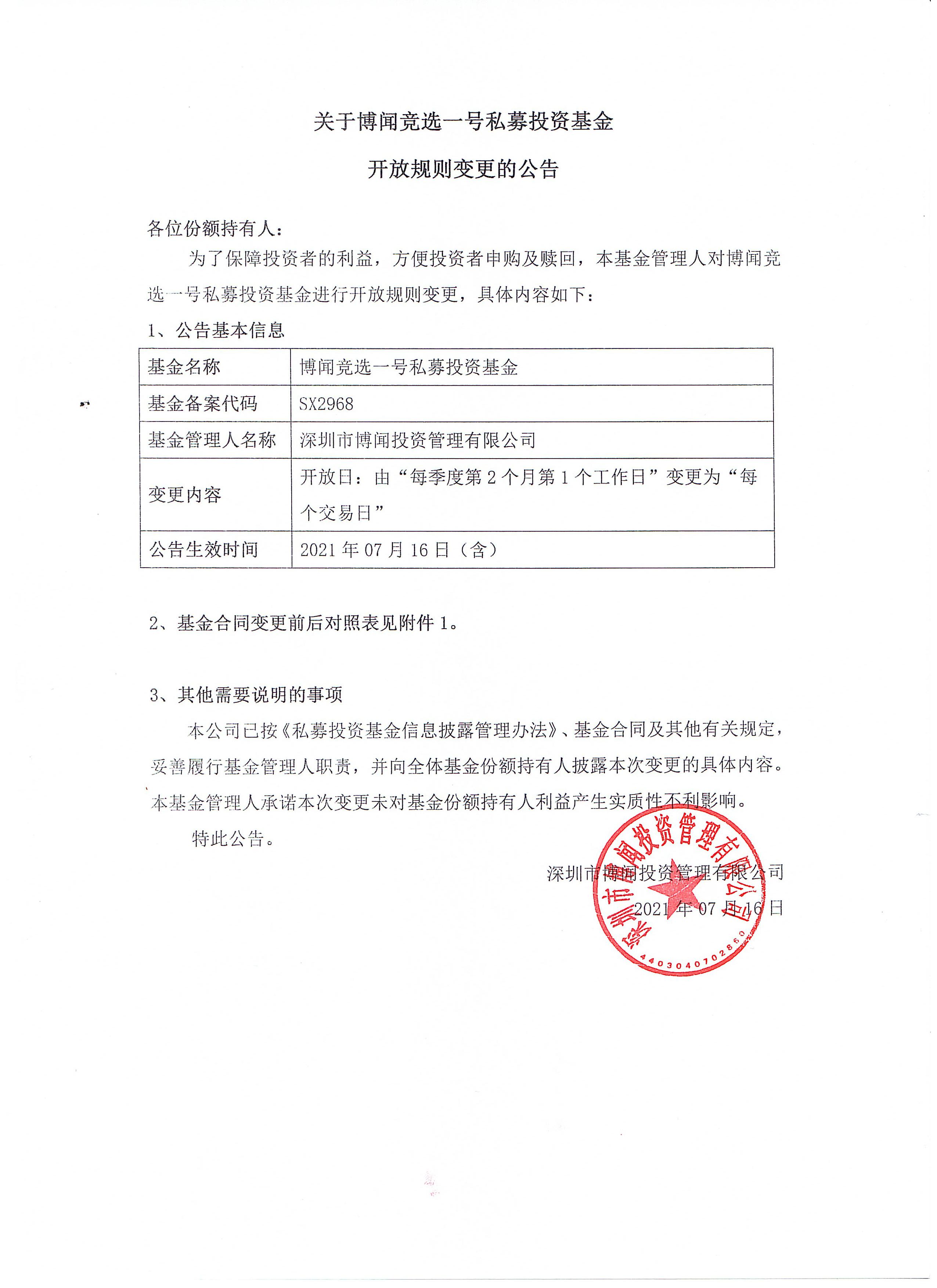 关于博闻竞选一号私募证券投资基金开放规则变更的公告