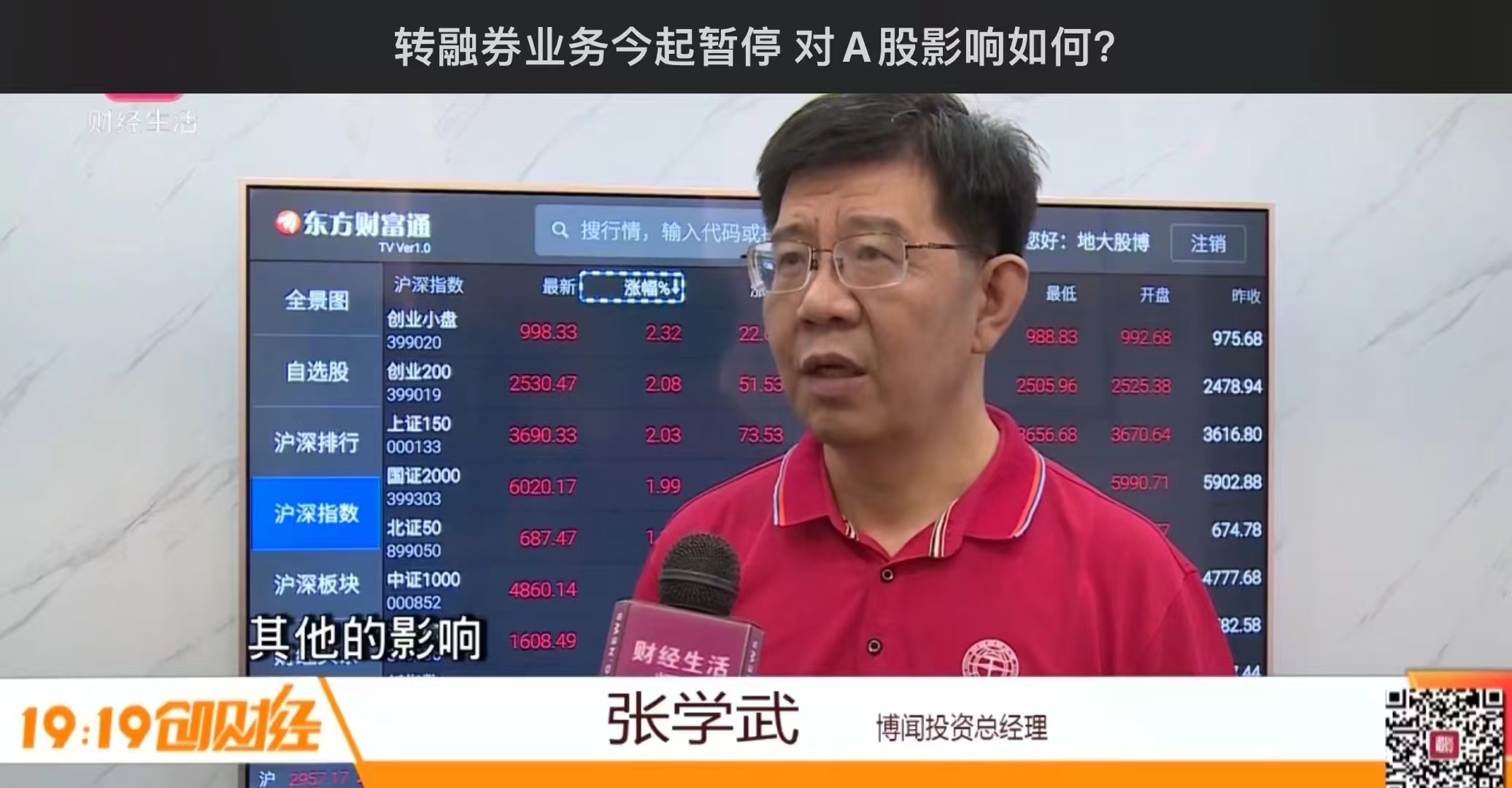 2024年7月11日,《1919创财经》栏目到我公司现场采访,我司总经理张学武先生受邀分析了暂停转融券业务对A股市场可能产生的影响。