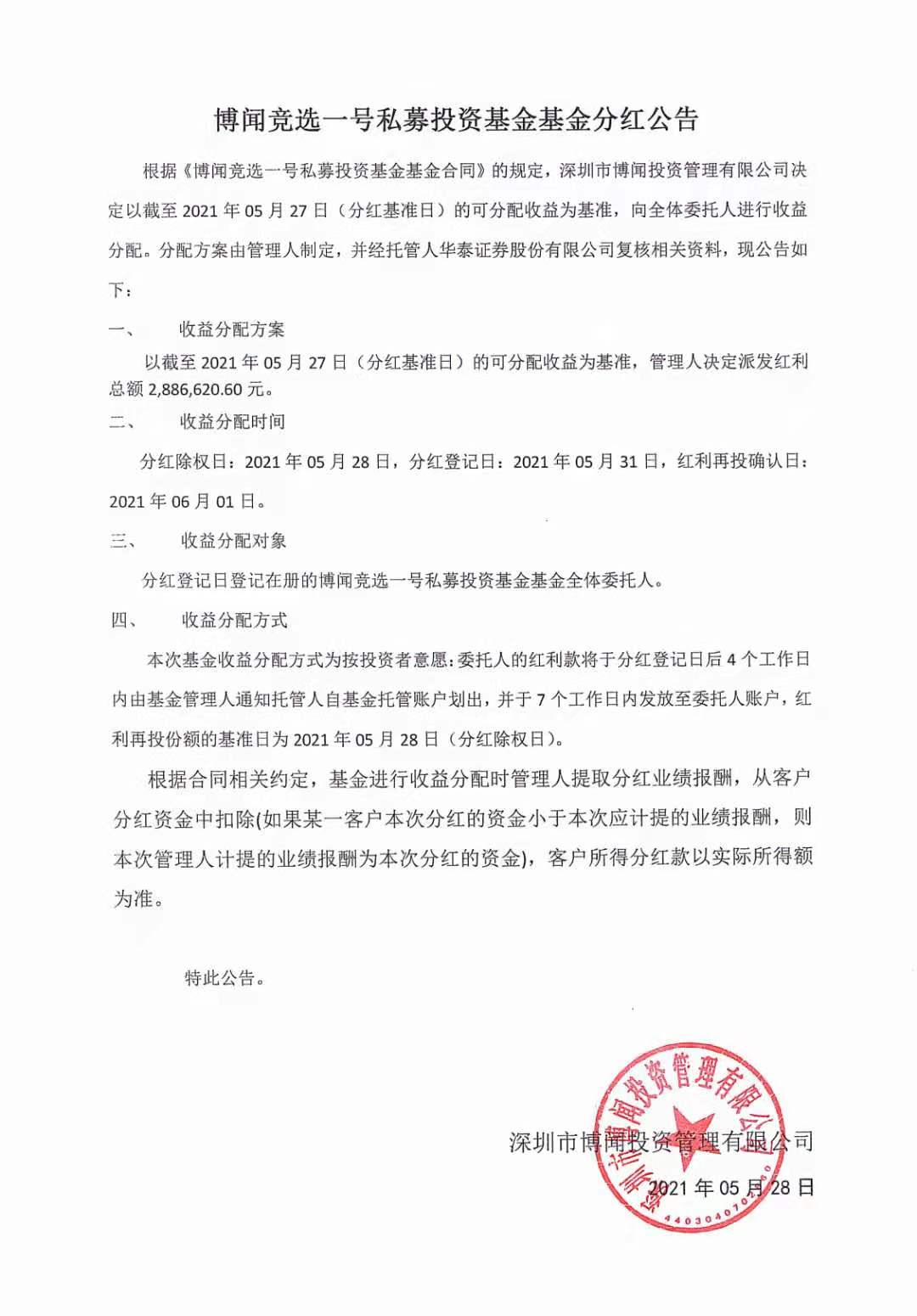 关于博闻竞选一号私募投资基金分红公告